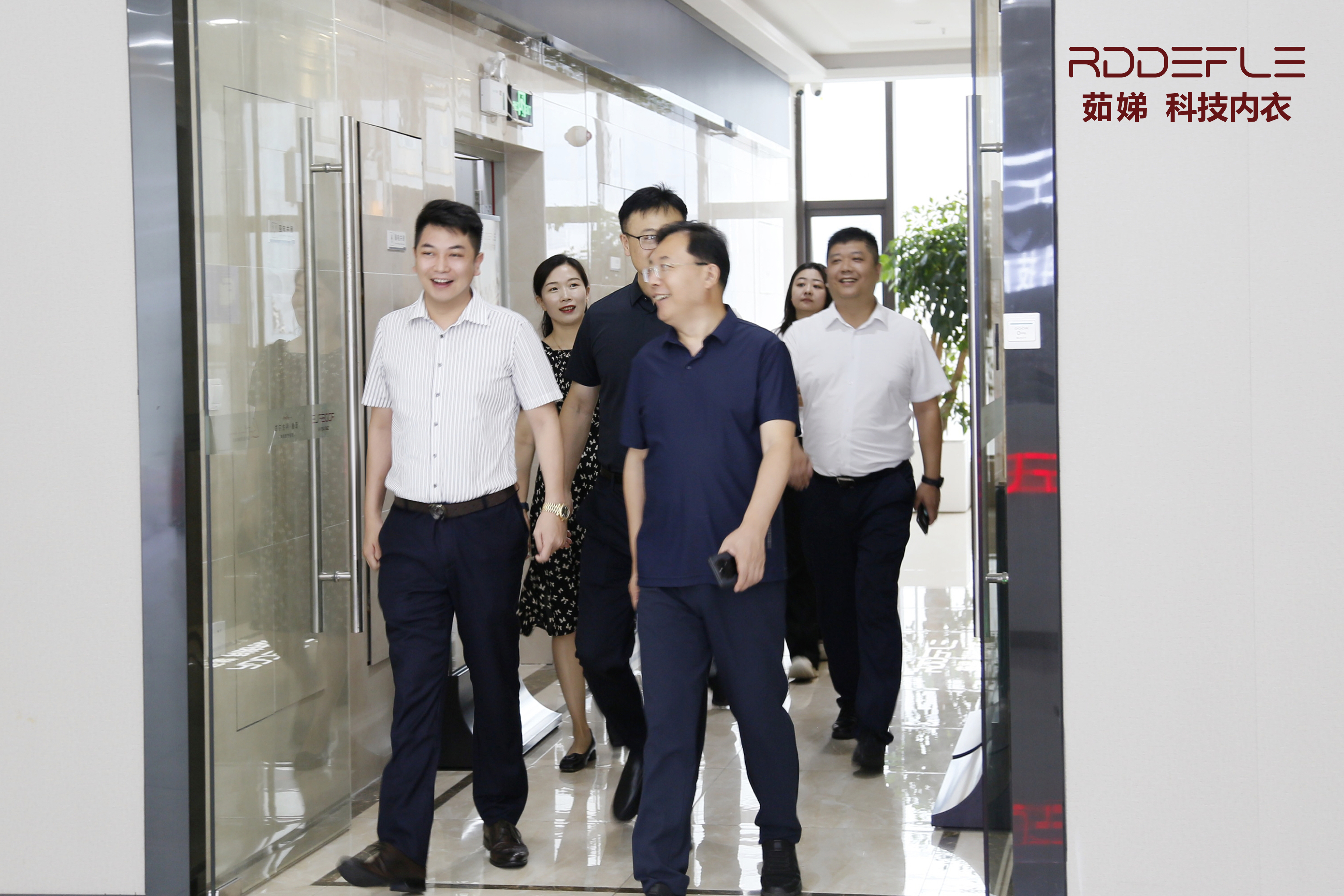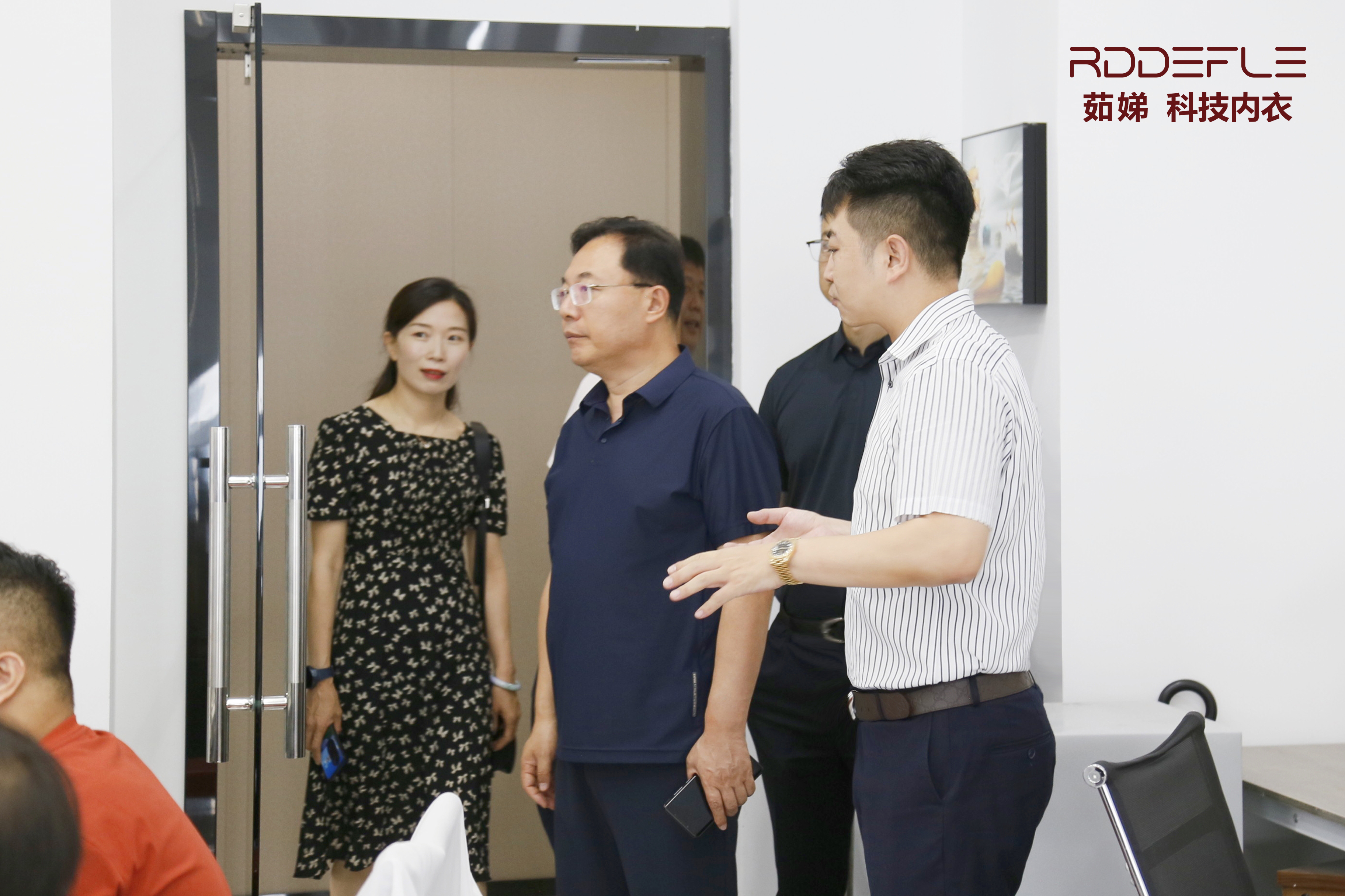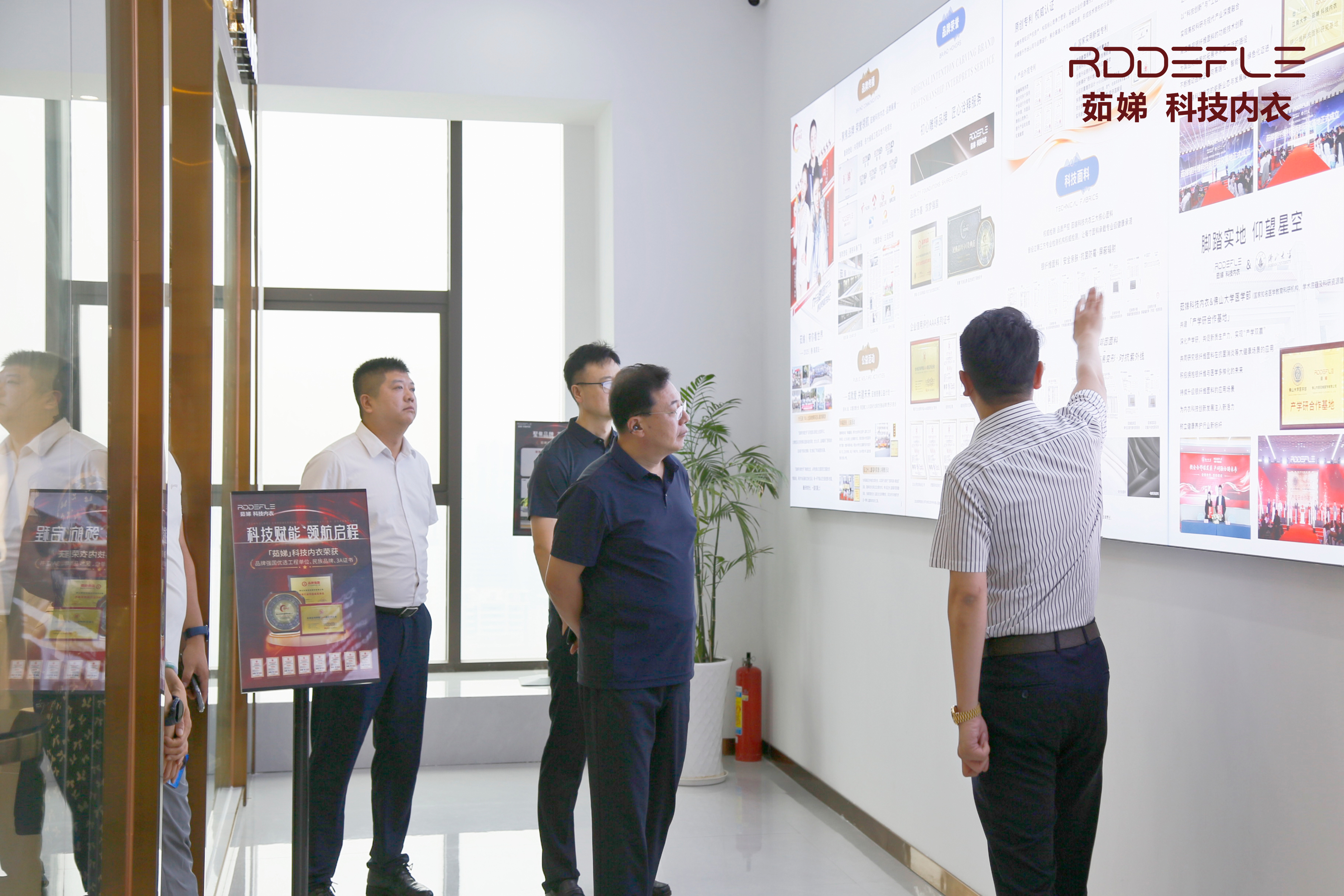 一行领导在茹娣股份总裁温德军先生的陪同下,深度考察了企业总部的创新实践。品牌展厅内,温德军总裁详细讲解了公司的科创战略、智能穿戴布局及银纤维技术突破等,获得了领导们的高度评价与赞赏。