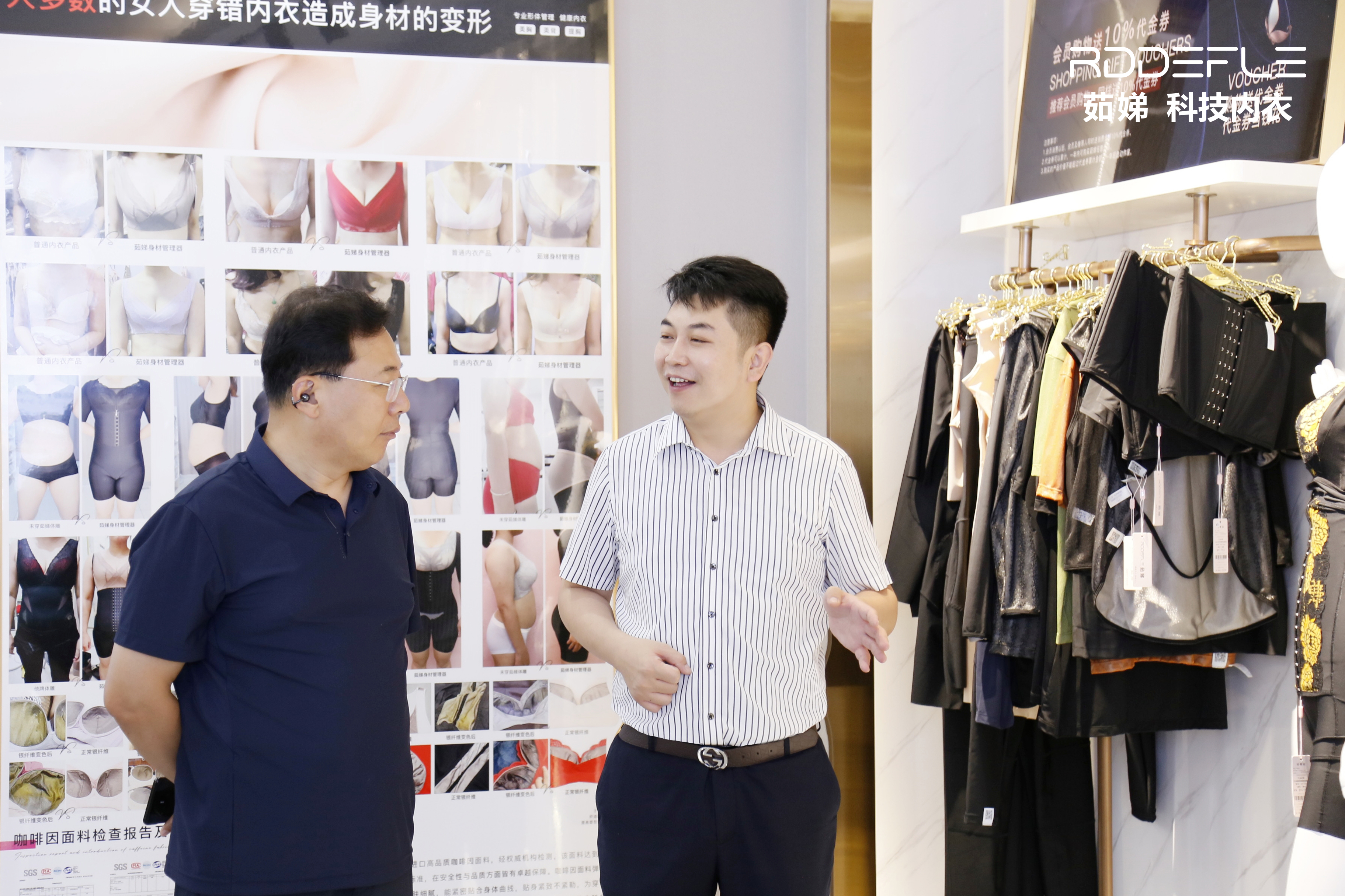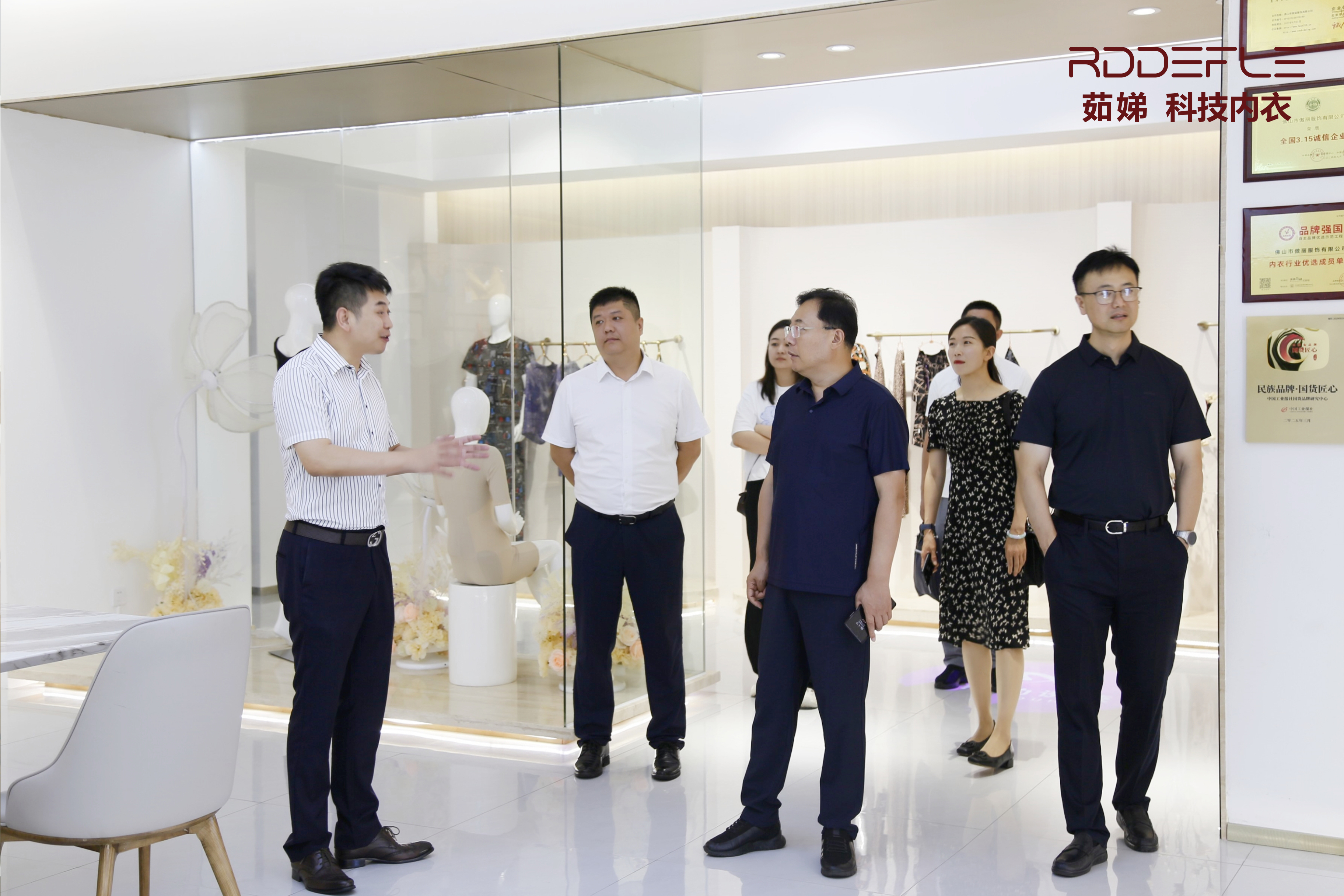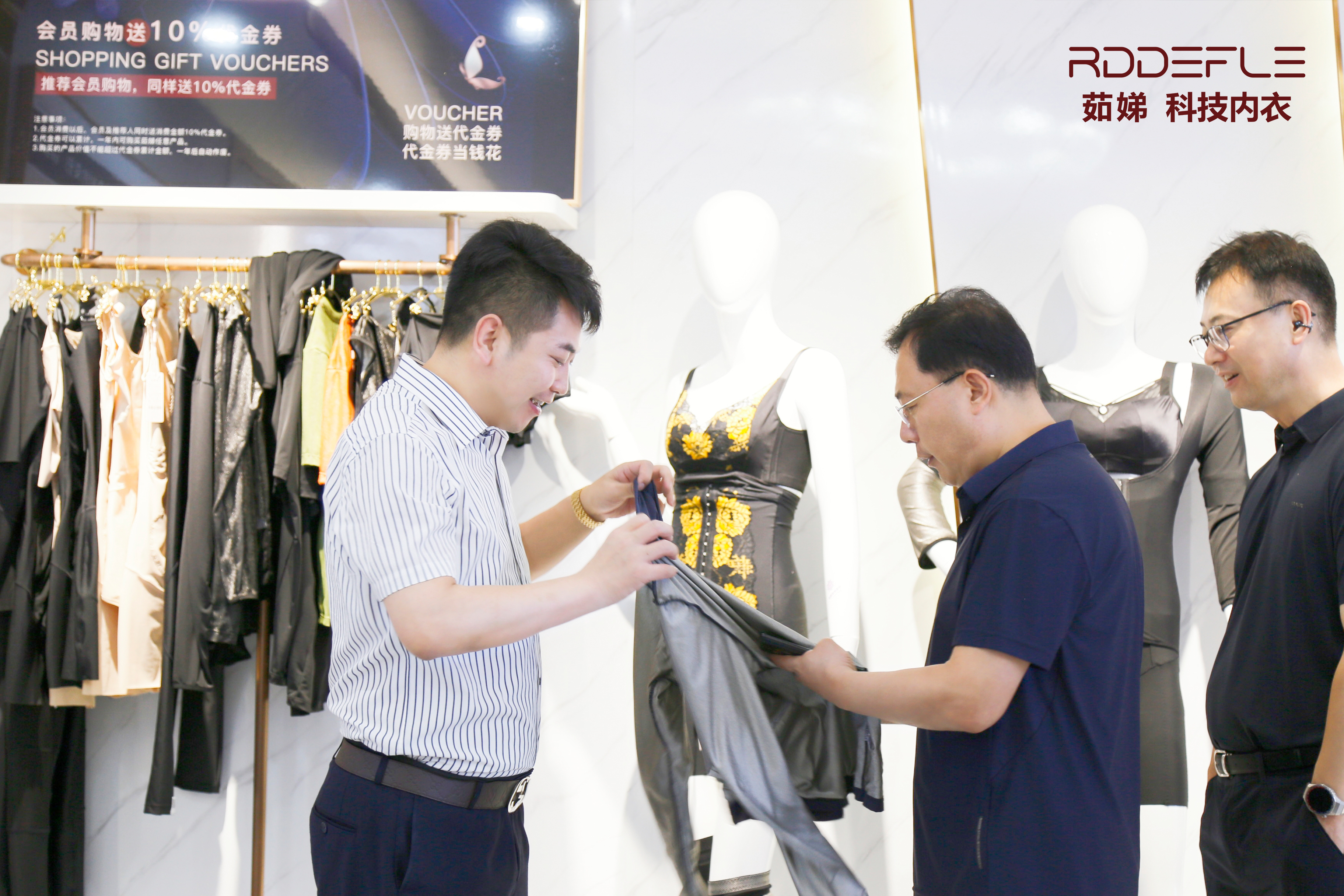 一行领导在茹娣股份总裁温德军先生的陪同下,深度考察了企业总部的创新实践。品牌展厅内,温德军总裁详细讲解了公司的科创战略、智能穿戴布局及银纤维技术突破等,获得了领导们的高度评价与赞赏。