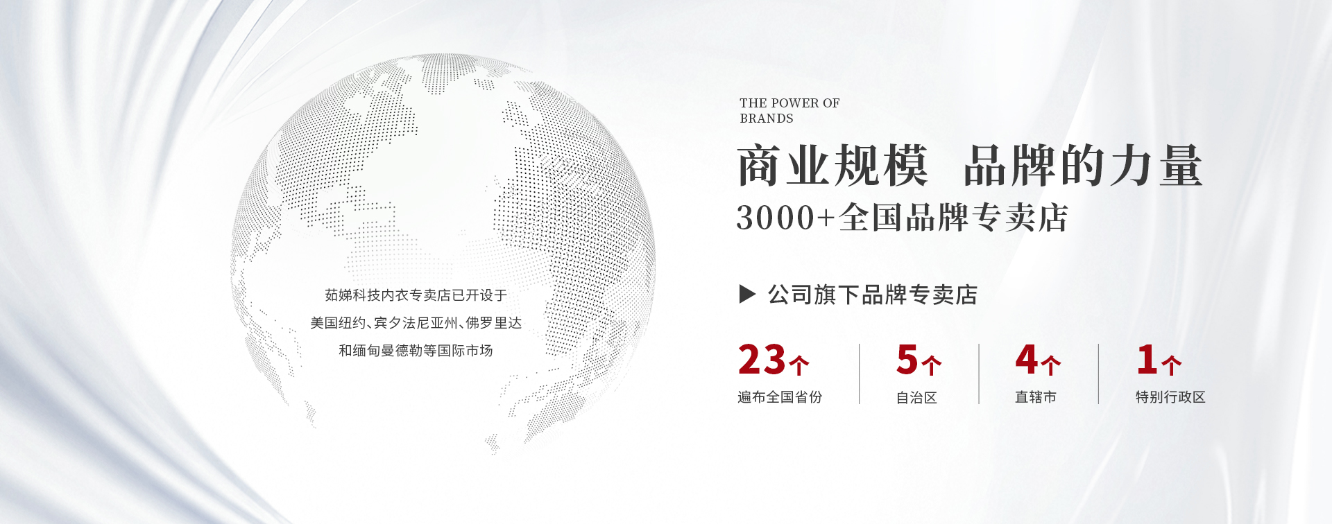 茹娣股份立足“创新为核,品质为王”理念,在全球市场持续闪耀。其线下品牌专卖店已突破3000家,深度覆盖中国各地,更叩开了国际市场的大门——成功进驻美国纽约、宾夕法尼亚州、佛罗里达以及缅甸曼德勒等海外地区,将科技内衣的魅力传递到世界各个角落。